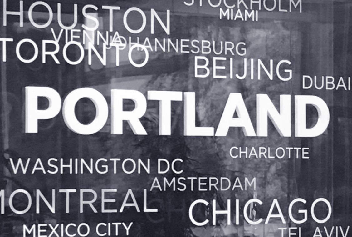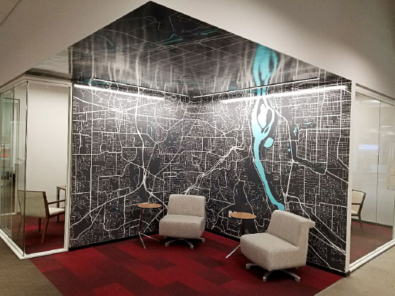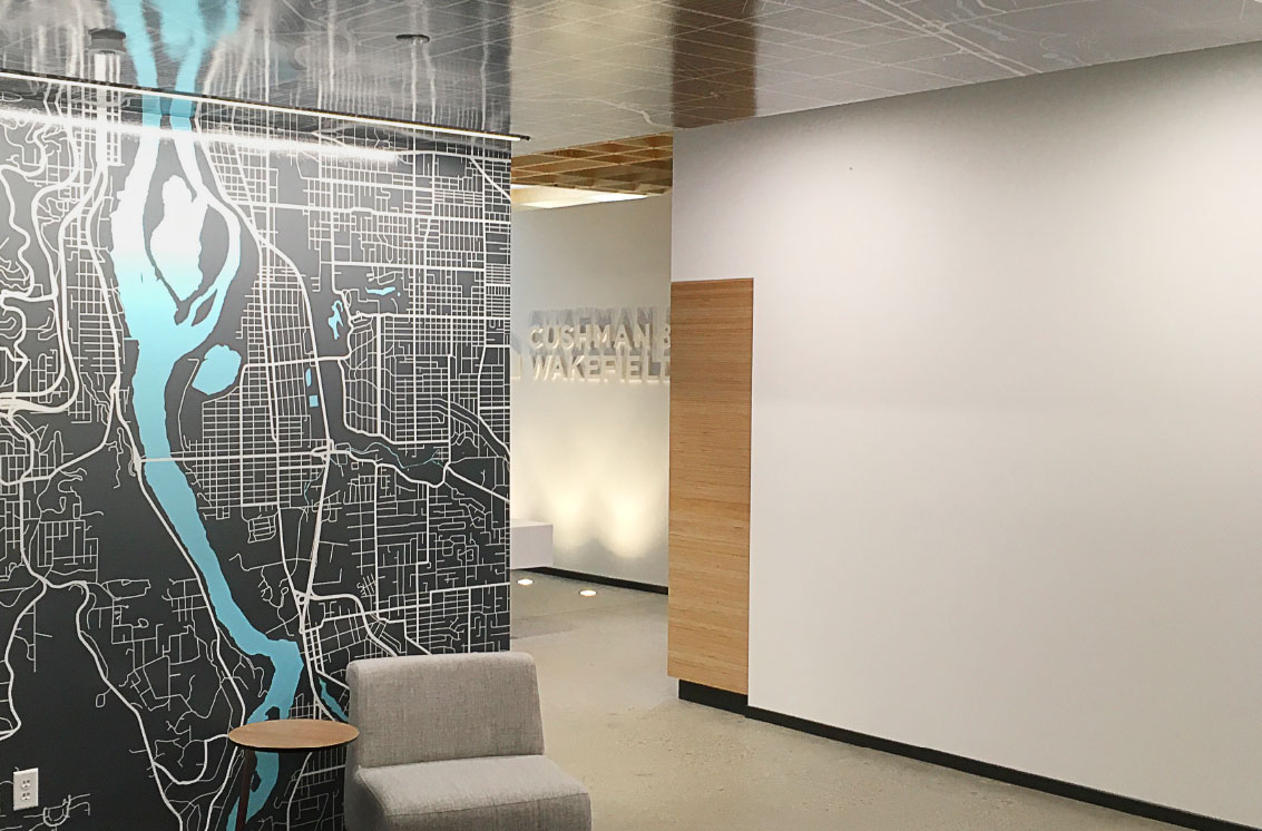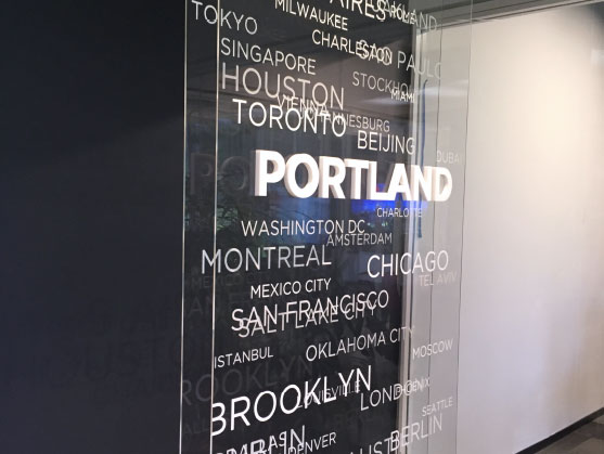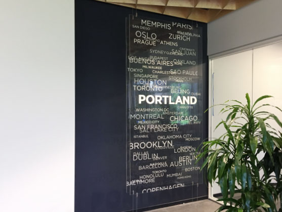 With over 300 offices worldwide, each Cushman & Wakefield location graphically pays tribute to the city they’re in. As Portland is known for its many bridges and the Willamette River that runs through the city, Forge designed and installed a city map graphic and produced two other large murals showcasing Portland’s most prominent bridges. The lobby tastefully greets clients with custom clear panels highlighting their many office locations, along with a white on white dimensional company logo at reception.